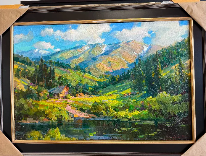 The following is a gorgeous oil painting by the master painter Ovanes Beberian. Painted in 2018 his colorist-impressionistic style is on full ddisplay. The vivid colors with the pond in the foreground with a mountain cottage set with cows at the base of the thawing spring mountains.  There is a deep interplay of shadows in the trees as well as the hills in the background.